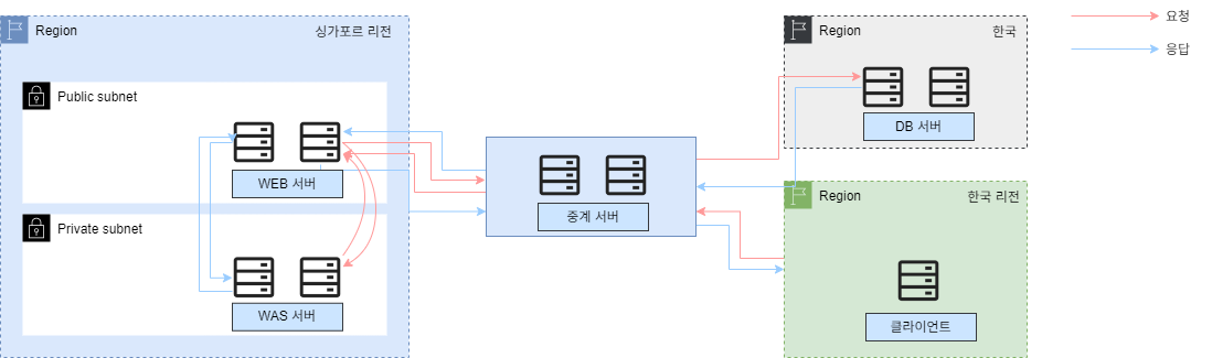 이 경우 국내에 있는 클라이언트에서 싱가포르 리전에 서비스에 접근할 때 지리적으로 레이턴시가 발생하게 됩니다.