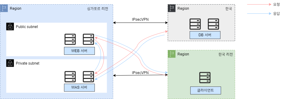 현재 인프라 구성 상 싱가포르 리전과 국내 IDC 환경이 IPsecVPN으로 연결되어 있고 싱가포르 리전과 한국 리전 역시 IPsecVPN으로 연결되어 있습니다. 앞선 요구사항으로 국내 IDC에는 DB 서버를 싱가포르 리전에는 WEB/WAS 서버를 배치하였습니다.