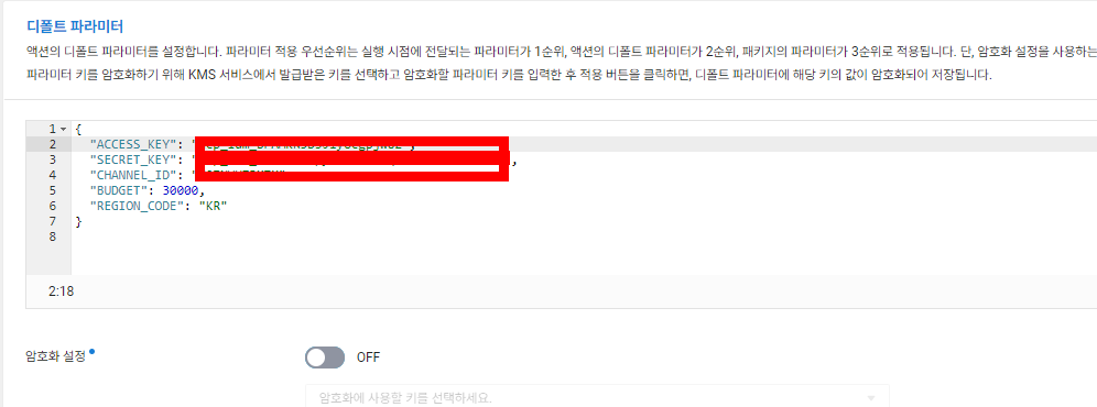 다음과 같이 디폴트 파라미터를 json 포맷으로 설정해준 후 KMS를 생성하여 암호화 설정하는 것이 보안상 매우 좋습니다. 디폴트 파라미터에서 간편하게 파라미터 값을 변경하여 적용할 수 있습니다.