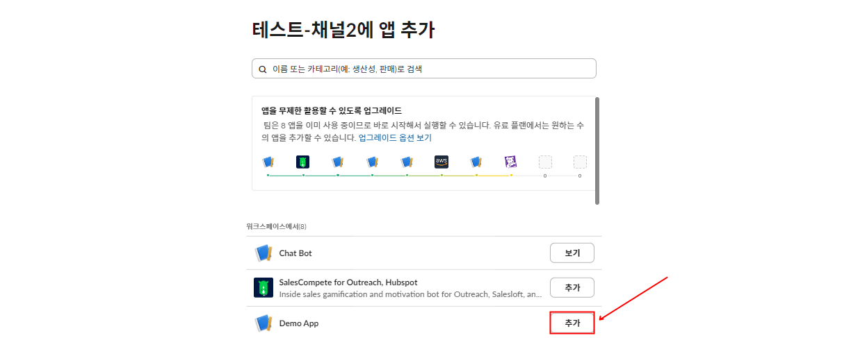 다음과 같이 채널에 생성한 앱을 추가해 줍니다.