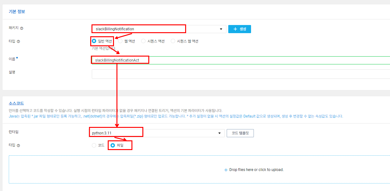API Gateway와 연동하지 않으므로 [일반 액션]을 선택한 후 소스 코드 런타임은 python3.11 타입은 라이브러리와 함께 올려야 하기 때문에 파일을 선택합니다.