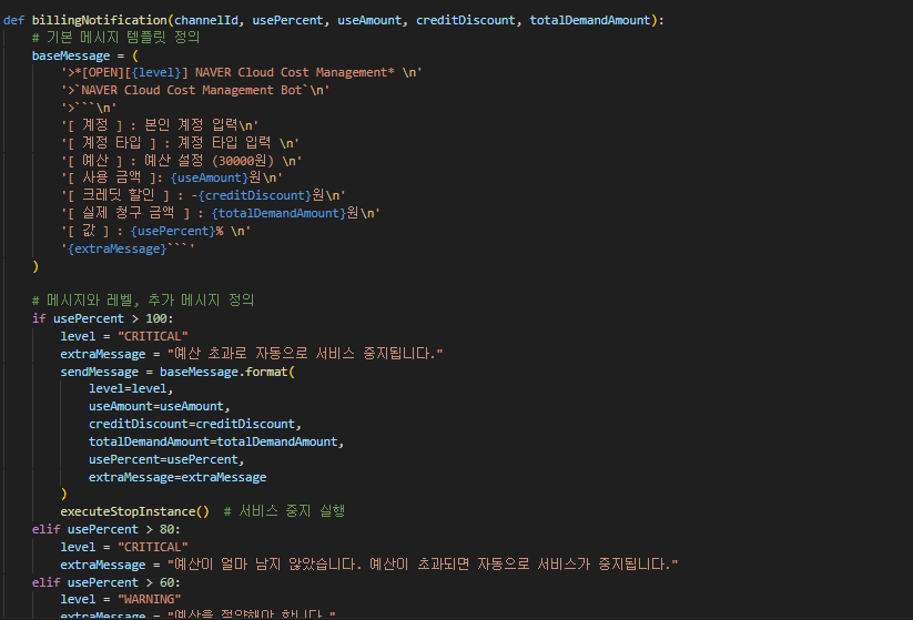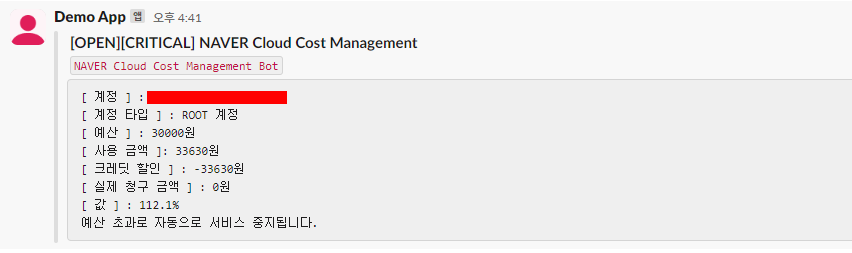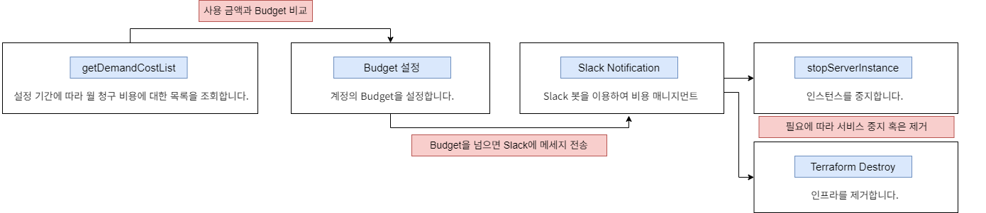 애플리케이션에서 비용 관리를 위해 Budget을 설정합니다. 사용 금액과 Budget을 비교하여 Budget을 넘겼을 때 곧 바로 사용하고 있는 서비스를 중지하거나 제거할 수 있지만 사용자가 컨트롤할 수 있도록 Slack에 전달하여 정보 확인과 제어를 합니다.