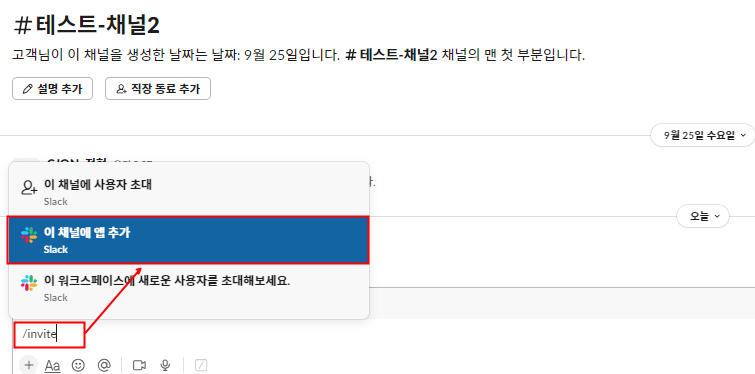 테스트 채널에 /invite를 입력한 후 이 채널에 앱을 추가합니다.