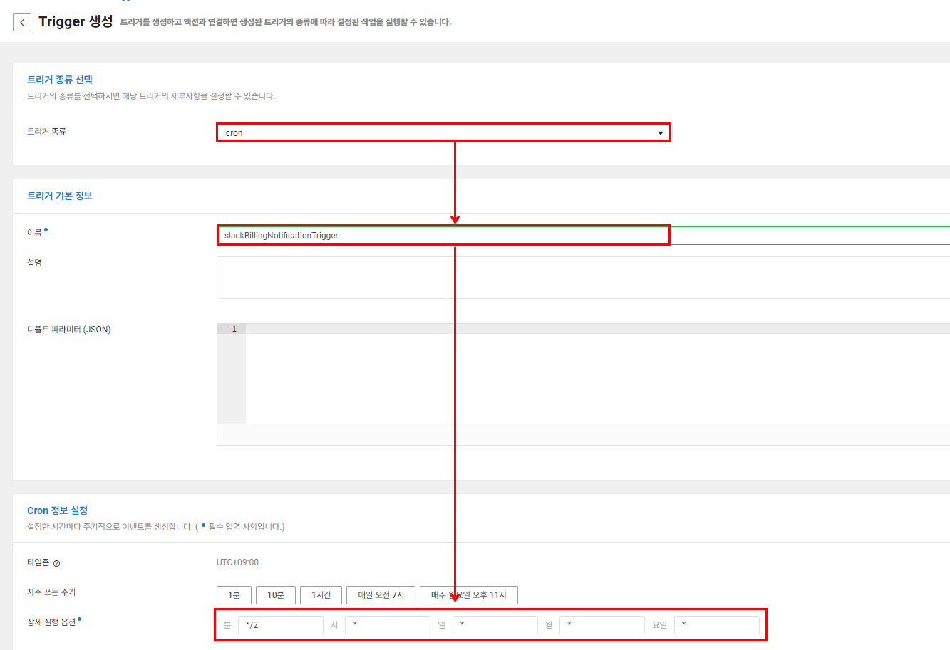 이렇게 확인이 끝났다면 Trigger에서 값을 업무 시작 시간으로 변경해 주면 매일 출근 시간에 계정에서 비용을 얼마나 사용했는지 확인해 볼 수 있습니다.
