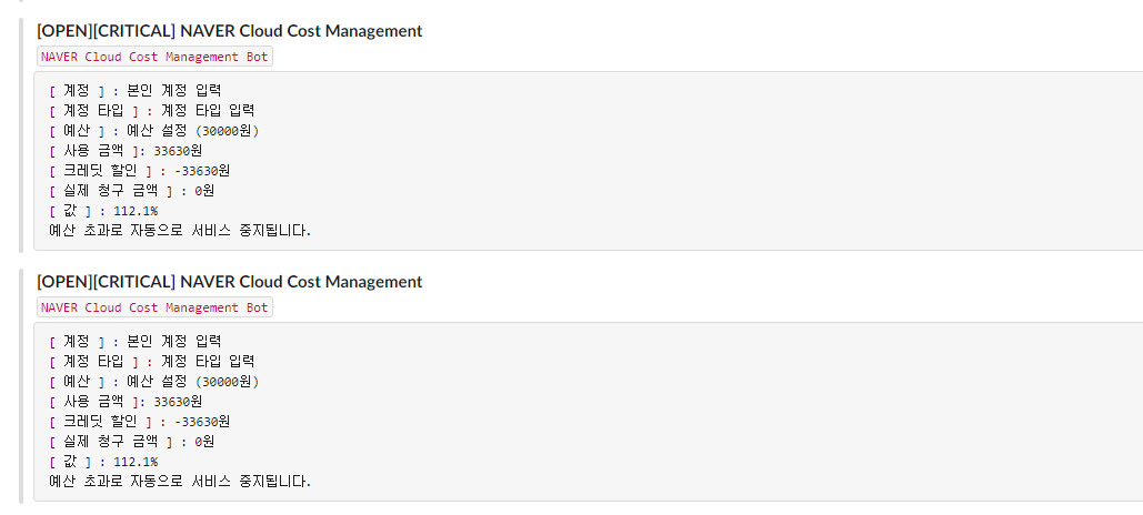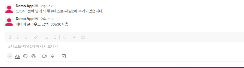 이쯤에서 애플리케이션을 실행하면 네이버 클라우드에서 사용한 금액을 Slack 메세지로 받아볼 수 있습니다. 저희는 여기서 더 나아가 Cron으로 트리거를 설정하고 사용자가 직접 서비스를 중지 혹은 제거할 수 있도록 커스텀하겠습니다.