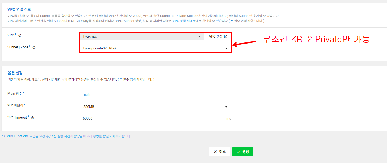 VPC 연결 정보에서는 무조건 KR-2 Private만 가능하기 때문에 설정한 후 [생성]합니다.