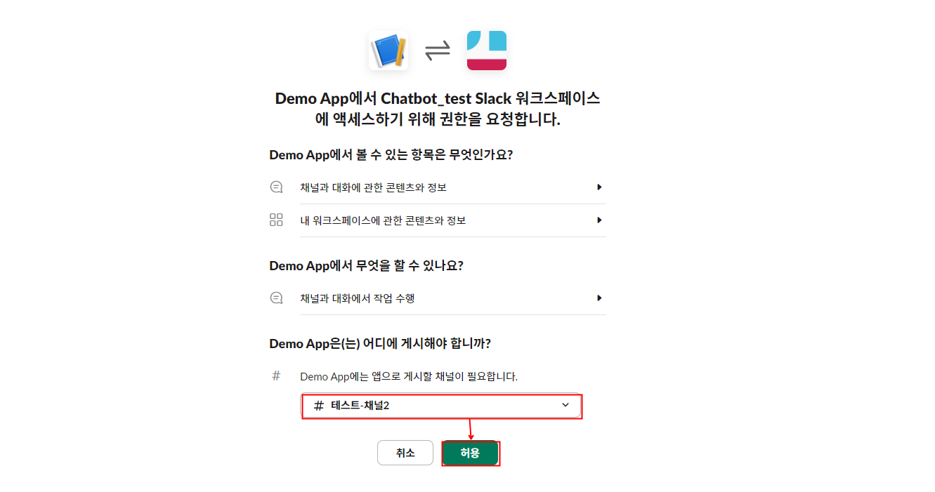 워크스페이스에 테스트 채널을 생성한 후 테스트 채널을 선택하여 [허용]합니다.