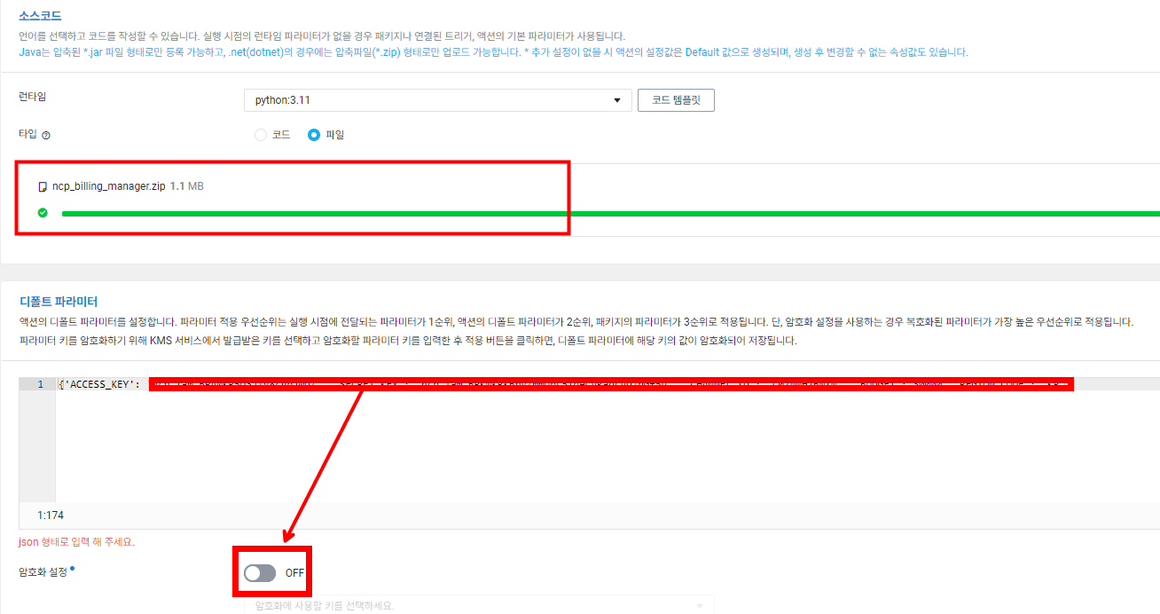 압축 파일을 올린 후 디폴트 파라미터를 설정합니다. 기본적으로 압축 파일 이름은 __main__.py 여야 Cloud Functions에서 인식합니다.