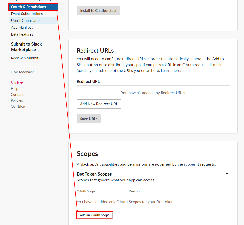 기본적으로 Slack Bot의 권한을 부여해주어야 하는데 OAuth & Permissions에서 설정 가능합니다. [Add an Oauth Scope]를 누릅니다.