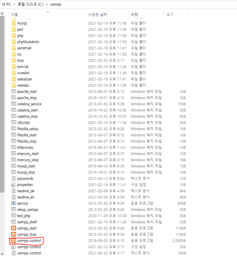 위에서 설정한 경로에 XAMPP가 설치되었습니다. [xampp-control]이라는 실행 파일을 클릭하여 실행합니다.