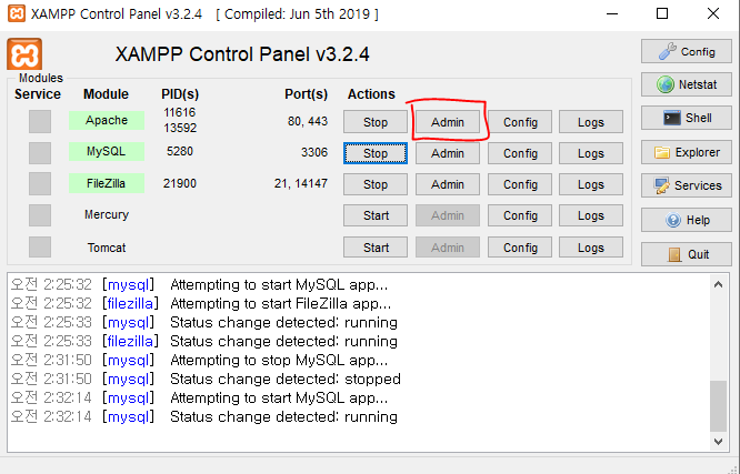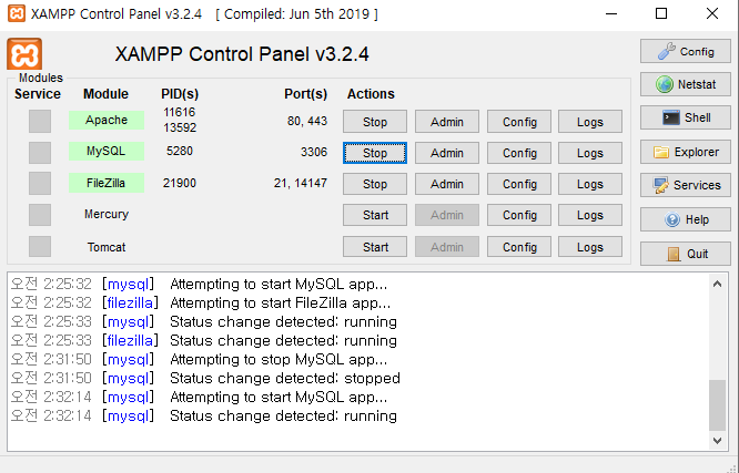 환경을 구성하는데 필요한 [Apache, MySQL, FileZilla]를 Start 합니다.