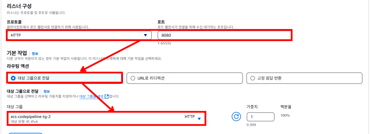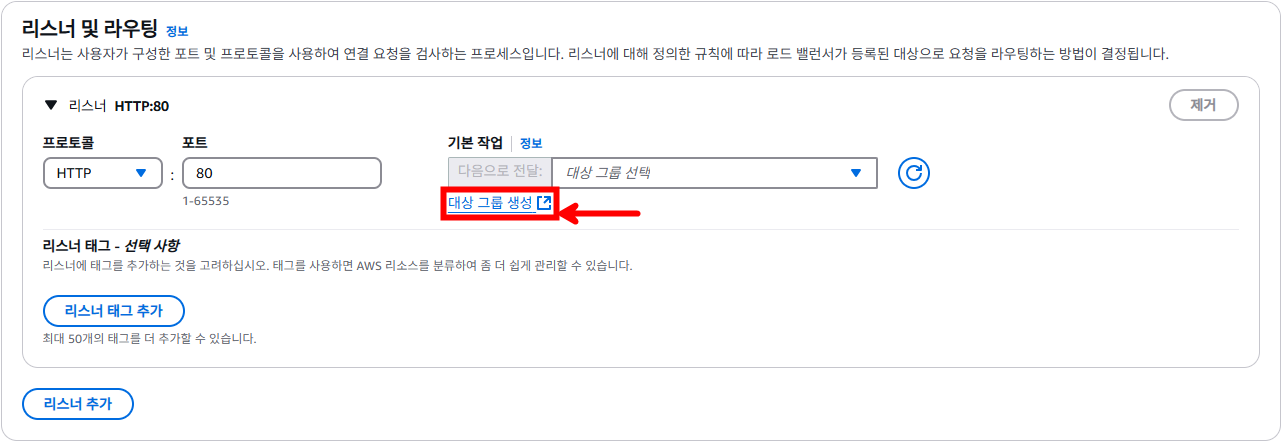다음과 같이 설정한 후 리스너를 추가해야 합니다. 보안 그룹에서 인바운드 허용이 필요합니다.