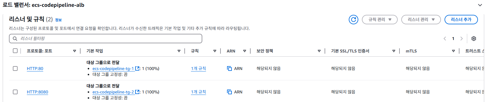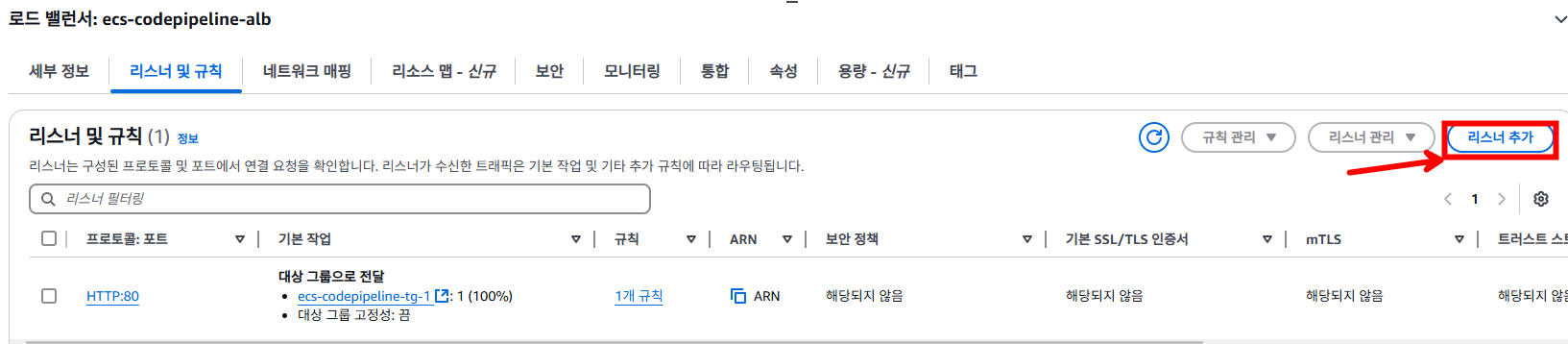 만들어진 두 번째 대상 그룹을 로드밸런서와 연결하기 위해 [리스너 추가]를 눌러줍니다.