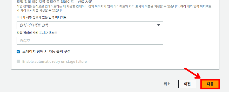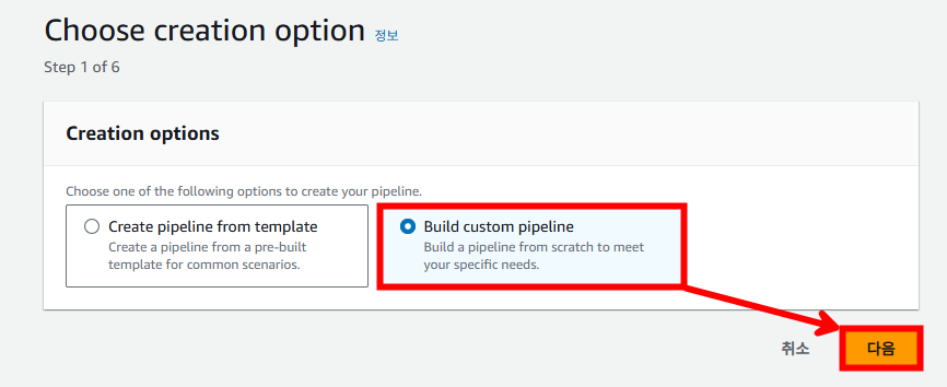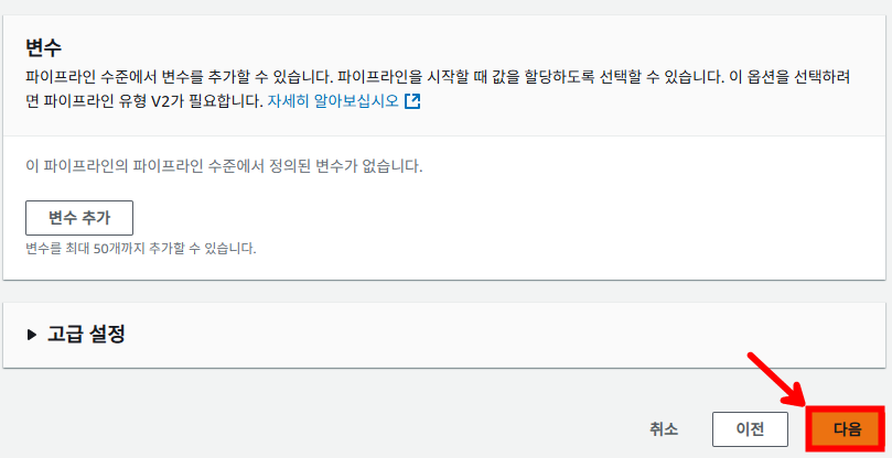 다음과 같이 파이프라인 설정을 진행하고 [다음]을 선택합니다.