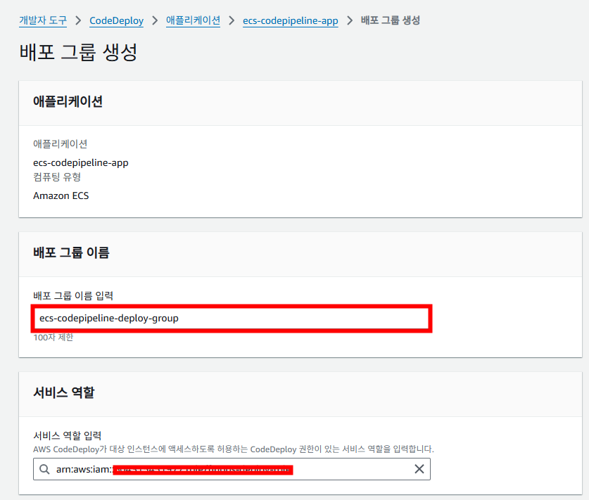 배포 그룹 이름과 CodeDeploy 권한이 있는 서비스 역할을 선택합니다.