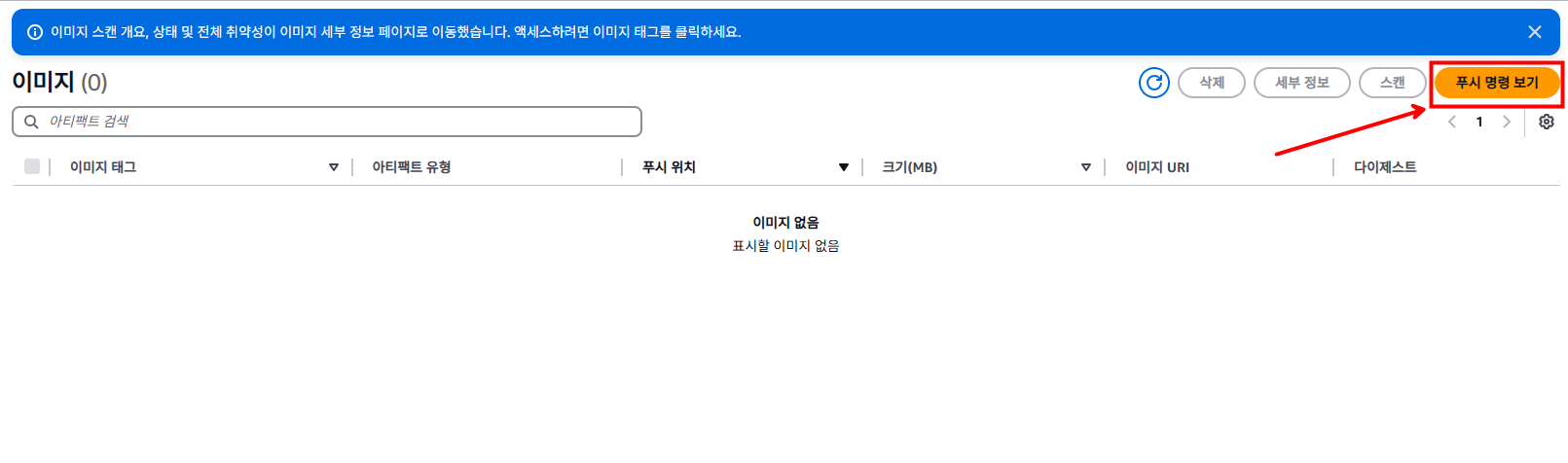 레포지토리를 선택하면 우측 상단에 [푸시 명령 보기]가 있는데 선택하면 ECR에 Push 하기 위한 간단한 명령어들을 보여줍니다.