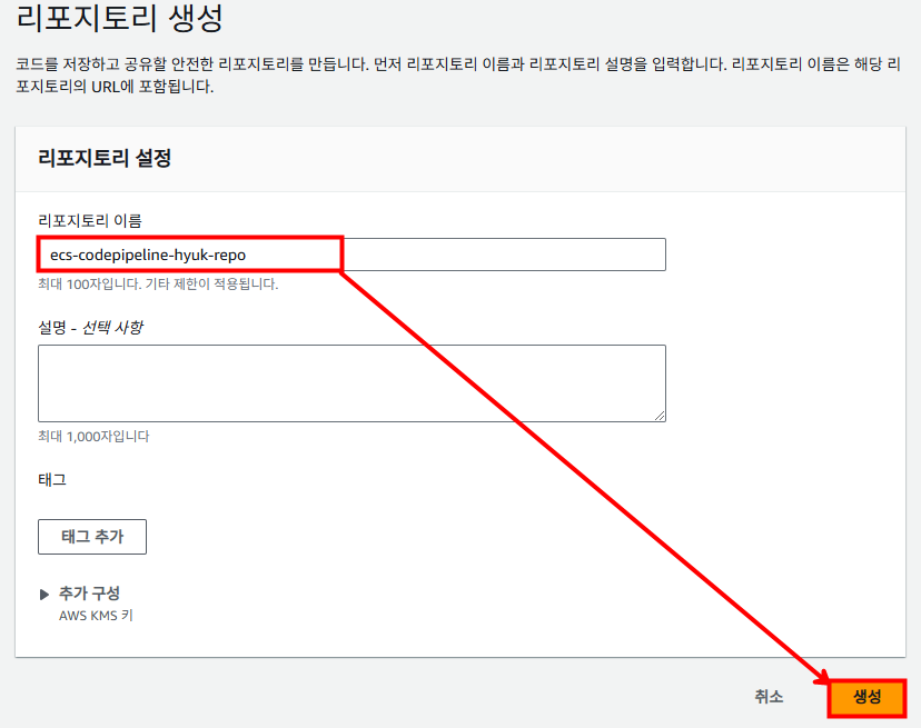 다음과 같이 CodeCommit 레포지토리 이름을 설정한 후 [생성]을 눌러 생성해 줍니다.