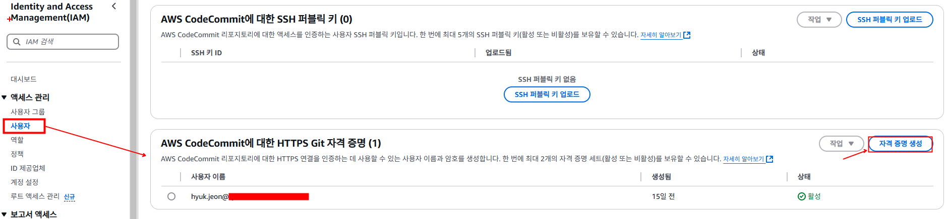 그전에 IAM - [사용자] - AWS CodeCommit에 대한 [HTTPS Git 자격 증명을 생성] 해야 합니다. 나온 자격증명은 CodeCommit에 연결할 때 자격증명 정보로 입력해야 합니다. (SSH로 연결하려는 경우 SSH 퍼블릭 키를 업로드합니다.)