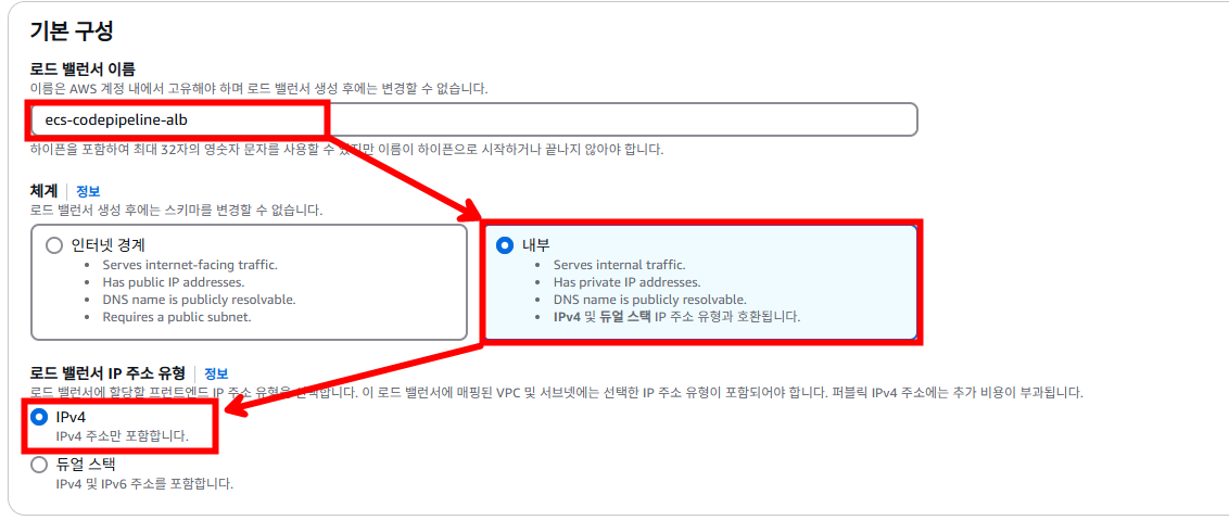 네트워크는 ECS와 동일한 VPC이고 ECS 대상을 등록하기 위해 내부로 선택합니다