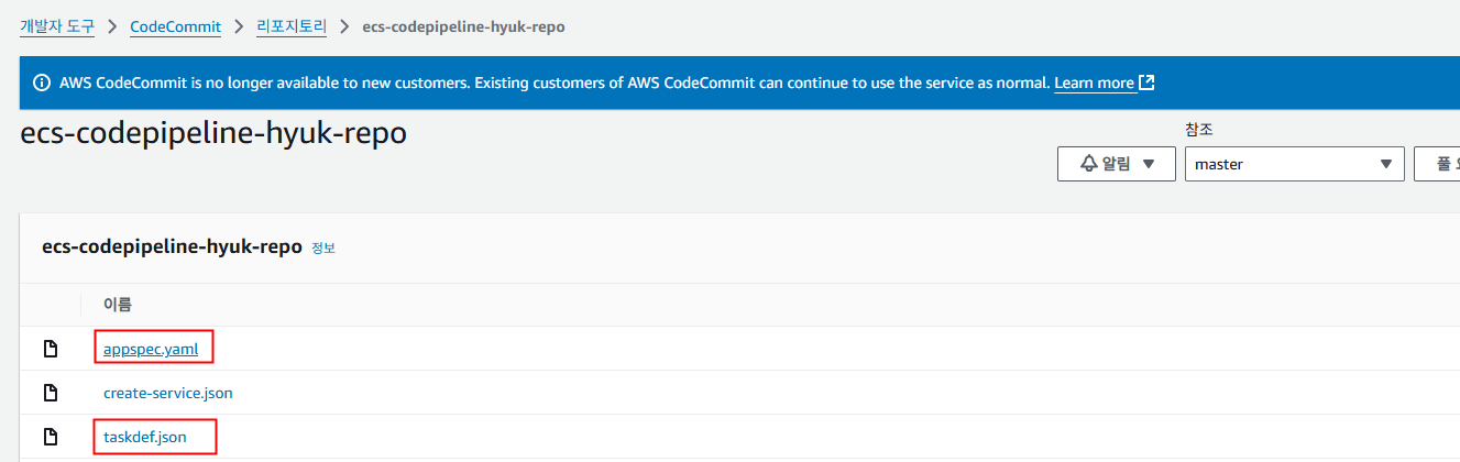 CodeCommit에는 appspec.yaml과 taskdef.json 파일만 올라가도 됩니다. 필요시 Build 단계에서 사용할 Dockerfile을 제공할 수도 있습니다.