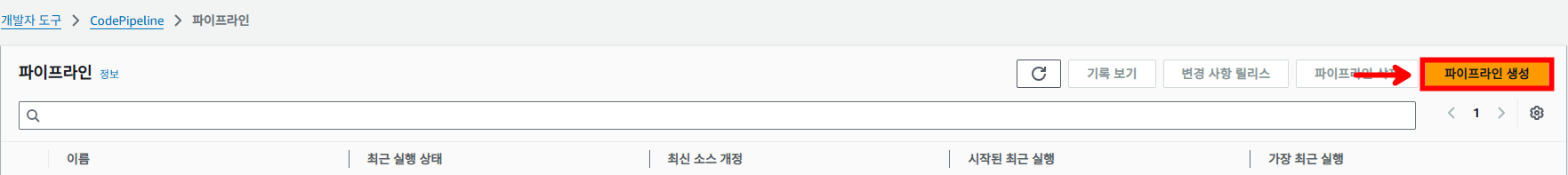 CodePipeline 서비스를 선택한 후 [파이프라인 생성]을 눌러줍니다.