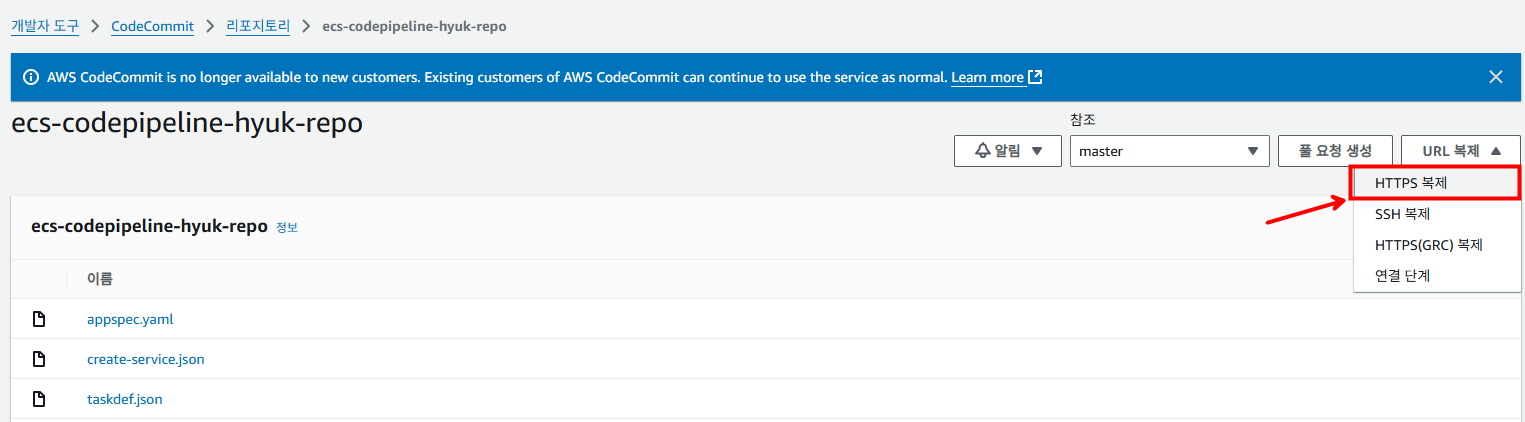 생성한 ecs-codepipline 레포지토리의 [HTTPS 복제]를 선택합니다.