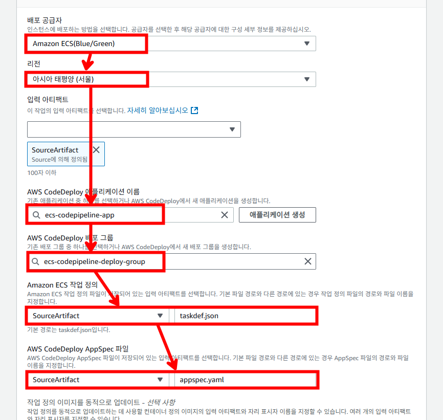 블루/그린 배포 작업을 위한 코드 파이프라인 구성입니다. 블루 그린 배포에서는 taskdef.json, appspec.yaml 파일을 저장소에 정의하여 사용합니다.
