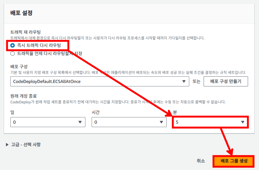 다음과 같이 [즉시 트래픽 다시 라우팅]으로 변경하고 테스트를 위해 배포 대기 시간을 5분으로 설정합니다. 기본은 1시간인데 1시간으로 설정하면 Blue/Green 배포 후 1시간 동안 Blue가 삭제되지 않고 대기합니다. 바꿨다면 [배포 그룹 생성]을 선택합니다. (테스트 용도이거나 일정 시간 대기가 필요한 작업이 아니라면 [원래 개정 종료]를 빠르게 하는 게 비용을 아낄 수 있습니다.)