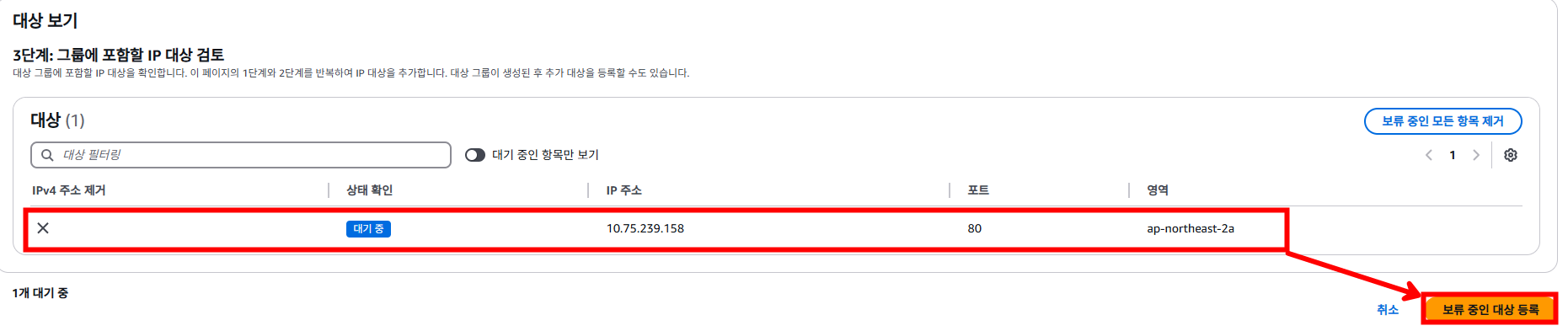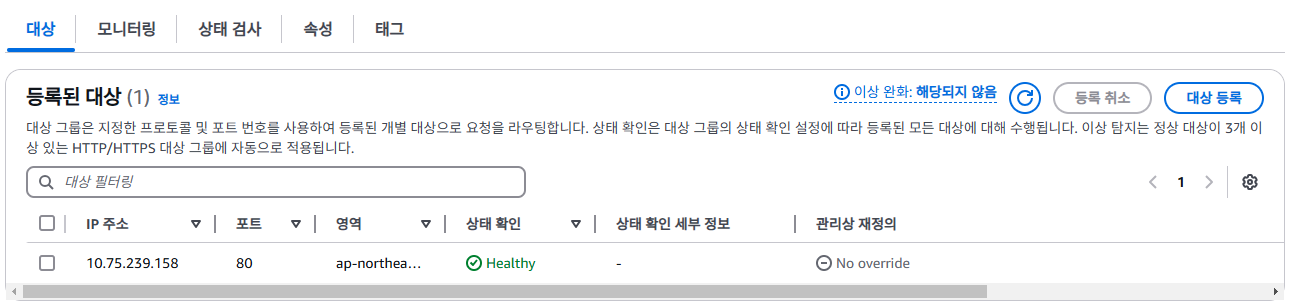 컨테이너의 사설 IP를 입력하여 대상 그룹의 대상으로 등록합니다.