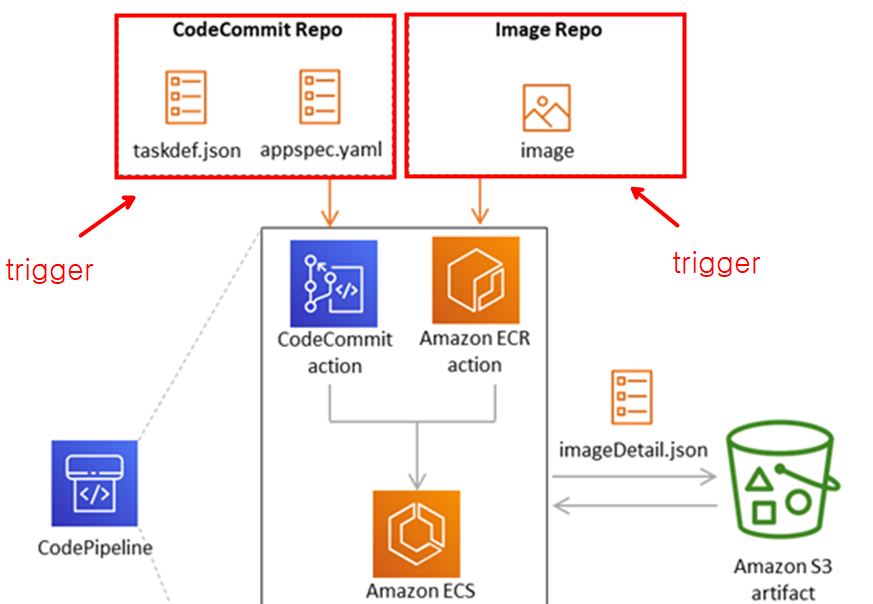 CodeCommit 레포지토리에 taskdef.json, appspec.yaml이 Push 되거나 ECR 레포지토리에 Image가 Push 되면 파이프라인이 동작합니다.