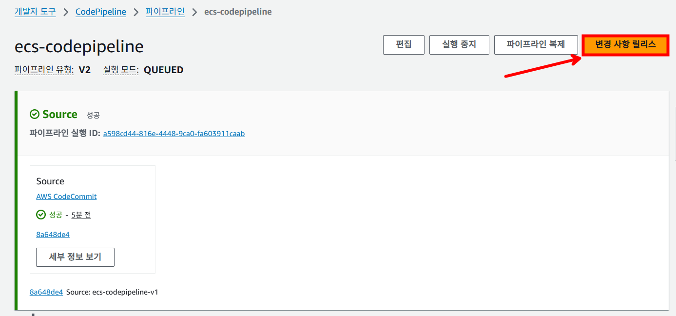 우측 상단에 있는 [변경 사항 릴리스]를 눌러서 CodePipeline을 실행합니다.