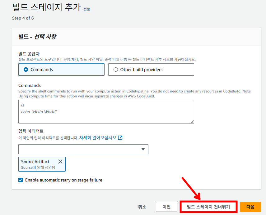 이번 실습에서 빌드 과정은 필요 없기 때문에 빌드 스테이지는 건너뛰겠습니다.
