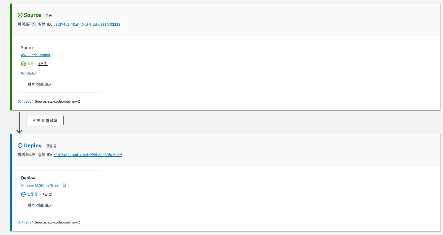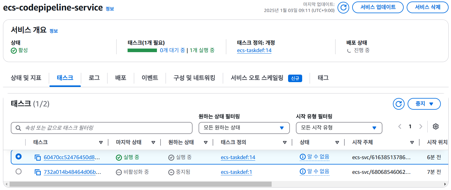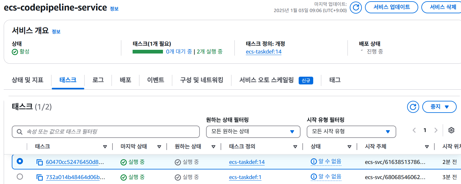 파이프라인이 실행되면서 ECS 서비스에 Green 배포가 되는 것을 확인할 수 있습니다.