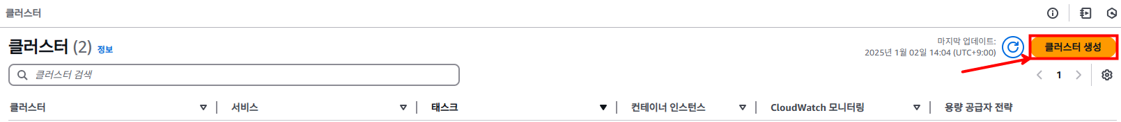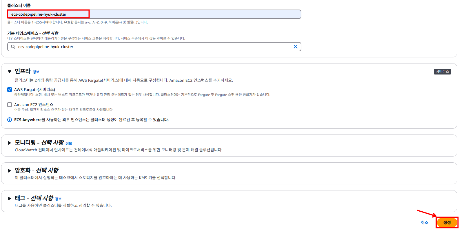 다음과 같이 ECS에서 [클러스터 생성]을 누르고 클러스터 이름을 지정한 후 [생성]을 눌러준 후 생성이 될 때까지 기다립니다.