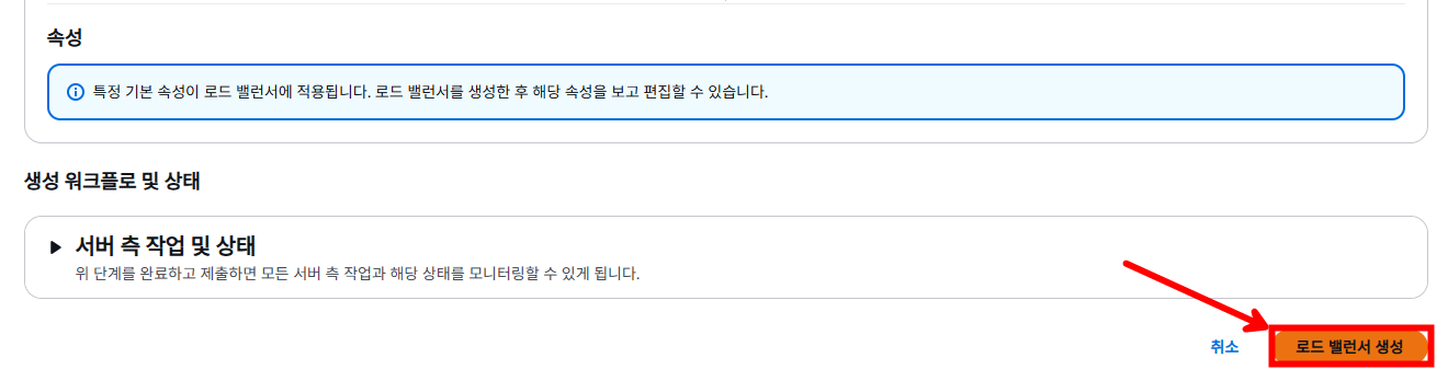 그 후 생성한 대상 그룹과 로드밸런서를 연결한 후 [로드 밸런서 생성]을 선택합니다.