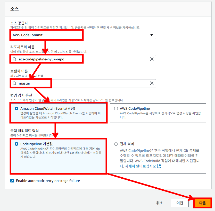 소스 스테이지 설정은 다음과 같이 진행해 주시고 [다음]을 눌러줍니다.