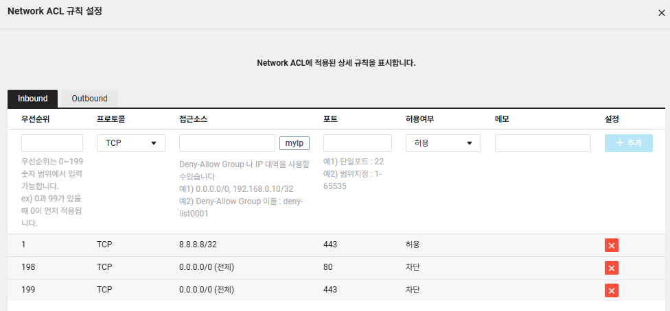 ACL을 구성할 때는 이렇게 포트별로 ACL을 구성하는 것을 추천드립니다. 관리편의성과 룰 개수 제한으로 인한 잠재적인 문제를 해결할 수 있습니다. 기존 NACL과 동일한 룰을 적용합니다.