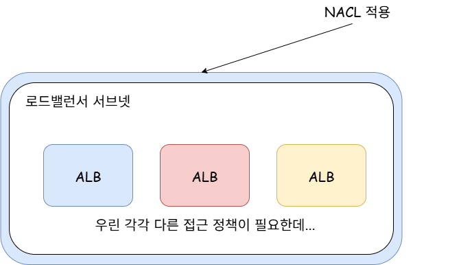 네이버 클라우드에서도 로드밸런서에 접근 통제할 수 없는 것을 우회하는 방안으로 로드밸런서 서브넷 대역을 쪼개는 방법을 안내하곤 했습니다. NACL에 적용할 경우 모든 로드밸런서가 같은 정책을 적용받기 때문입니다.