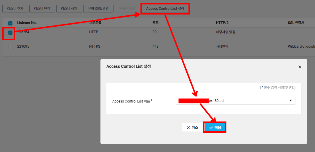 해당 로드밸런서 리스너에 맞는 ACL 룰을 적용합니다. ACL 선택 후 [적용] 선택