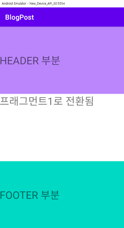 <?xml version="1.0" encoding="utf-8"?> <LinearLayout xmlns:android="http://schemas.android.com/apk/res/android" xmlns:app="http://schemas.android.com/apk/res-auto" xmlns:tools="http://schemas.android.com/tools" android:layout_width="match_parent" android:layout_height="match_parent" android:orientation="vertical" tools:context=".MainActivity"> <LinearLayout android:layout_width="match_parent" android:layout_height="wrap_content" android:layout_weight="1" android:background="@color/purple_200"> <TextView android:layout_width="match_parent" android:layout_height="wrap_content" android:textSize="30dp" android:layout_gravity="center_vertical" android:text="HEADER 부분"/> </LinearLayout> <FrameLayout android:layout_width="match_parent" android:layout_height="wrap_content" android:layout_weight="1" android:id="@+id/frameLayout"> <TextView android:layout_width="match_parent" android:layout_height="wrap_content" android:textSize="30dp" android:layout_gravity="center_vertical" android:text=""/> </FrameLayout> <LinearLayout android:layout_width="match_parent" android:layout_height="wrap_content" android:layout_weight="1" android:background="@color/teal_200"> <TextView android:layout_width="match_parent" android:layout_height="wrap_content" android:textSize="30dp" android:layout_gravity="center_vertical" android:text="FOOTER 부분"/> </LinearLayout> </LinearLayout>