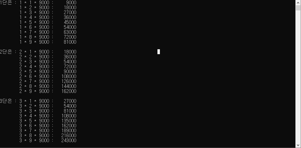 그냥 구구단으로 출력하고 싶으시다면 * 9000 부분을 제거해주시면 됩니다.