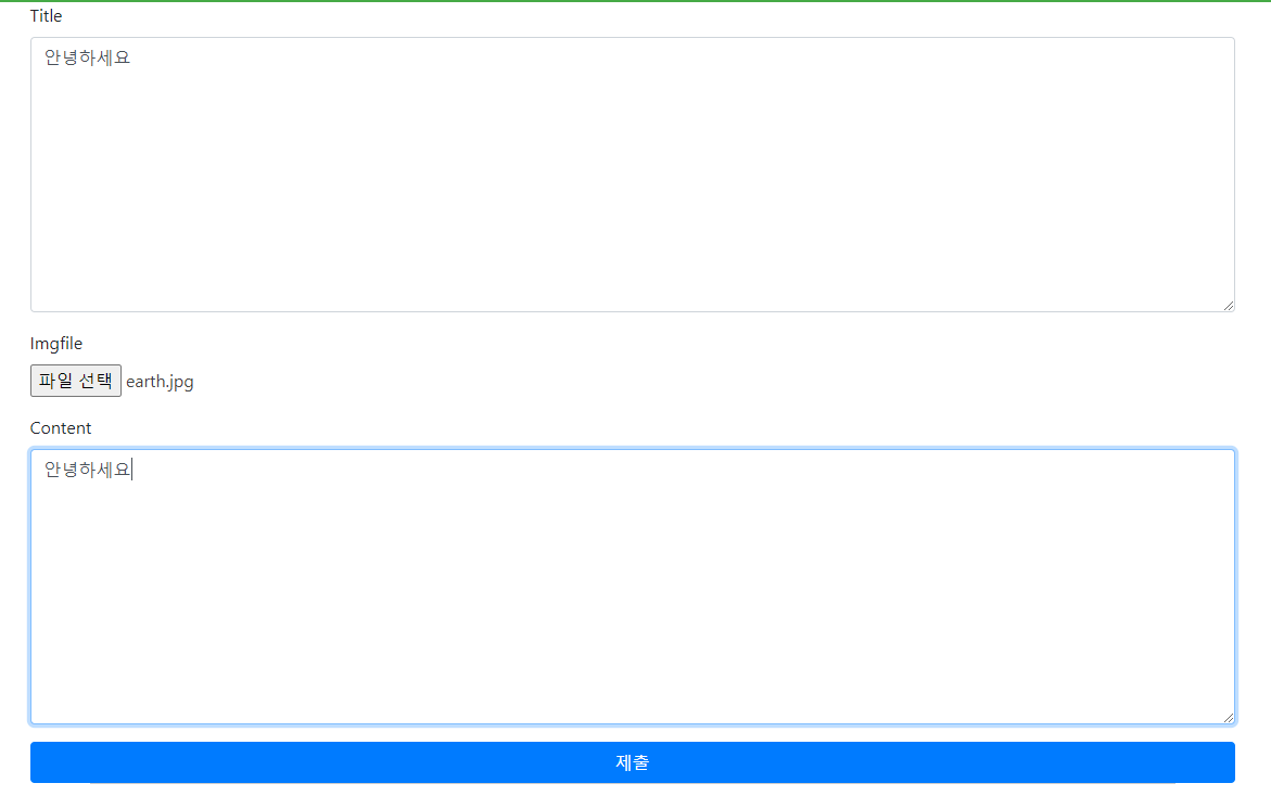 브라우저에 접속해 화면을 보시면 [title, imgfile, content]에 대한 입력할 수 있는 폼이 보입니다.