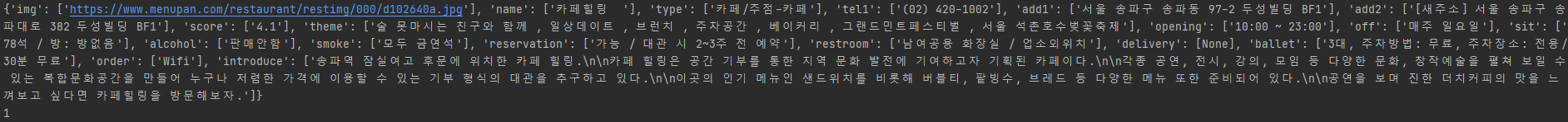 크롤링 결과로 카페의 이미지 주소부터 세부 정보까지 모두 딕셔너리에 담겨서 표시가 된 모습이다.
