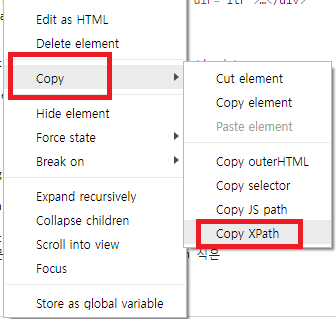 다음과 같이 요소를 우클릭했을 때 나오는 copy를 통해 css_selector, xpath 등 요소의 경로를 쉽게 따올 수 있습니다.