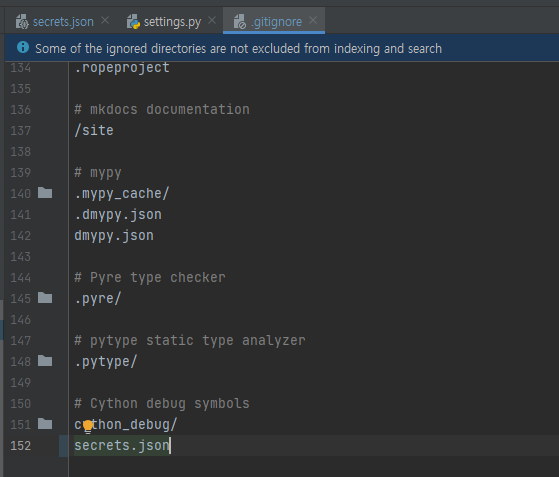 불러와 주시면 됩니다. 하지만 여기서 끝내시면 secrets.json 파일이 실수로 같이 올라갈 수 있습니다.