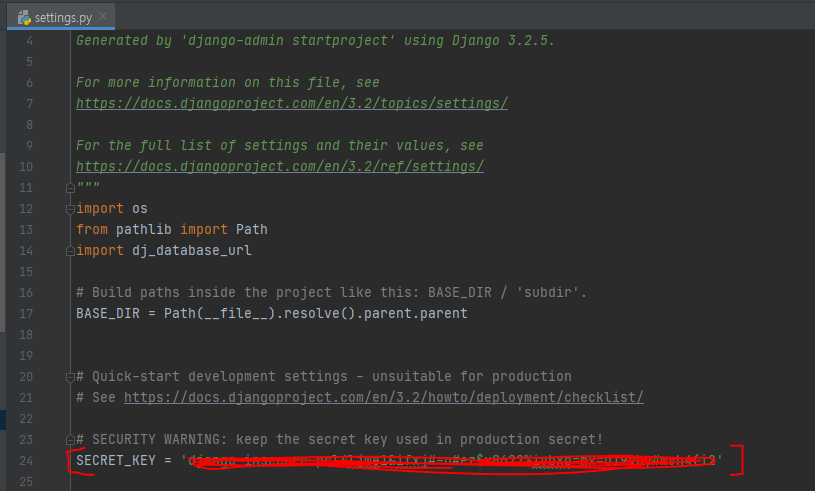 그 후 settings.py 에서 SECRET_KEY 붉은 줄 부분을 입력 부분에 붙여 넣어줍니다.