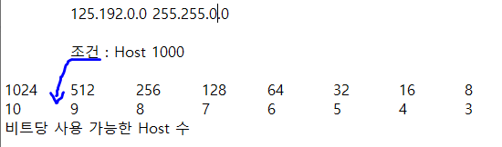 125.192.0.0 255.255.0.0의 네트워크를 1000개의 Host를 설치할 수 있는 Subnet으로 만들어라