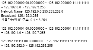 - 변경된 서브넷 마스크(Subnet mask) 값: 255.255.252.0
