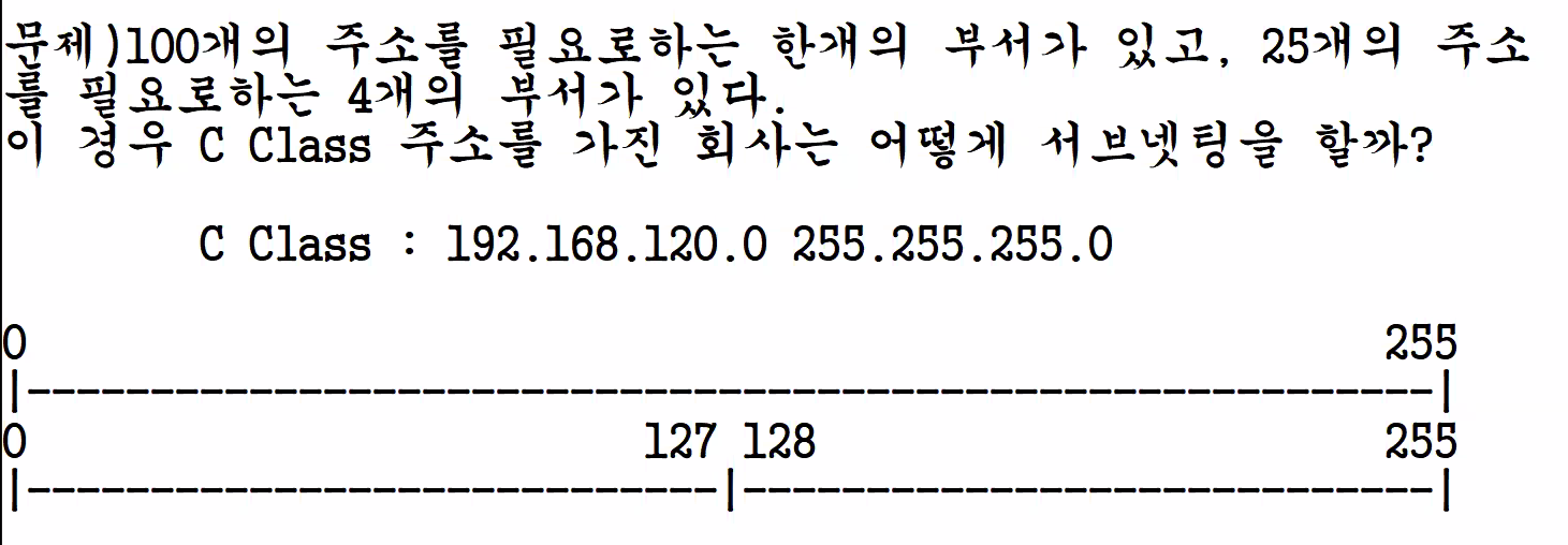 100개의 주소를 필요로 하는 한 개의 부서가 있고, 25개의 주소를 필요로 하는 4개의 부서가 있다. 이 경우 C Class 주소를 가진 회사는 어떻게 Subnetting을 할까?