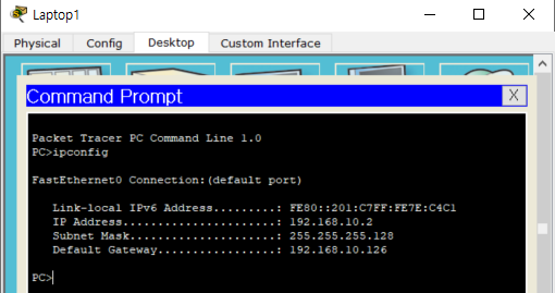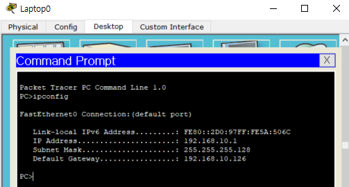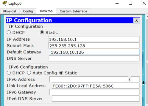 랩탑 1의 IP configuration에 들어가 IP address, Subnet mask, gateway 주소 설정